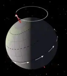 La précession de l'axe de rotation terrestre dessine un cercle sur la sphère céleste. Cependant, ce cercle n'est pas parfait. L'attraction de la Lune, et dans une moindre mesure du Soleil, entraîne ce qu'on appelle la nutation. En effet, la Lune attire la Terre (nous pouvons d'ailleurs le voir avec le phénomène des marées) et cette attraction se remarque par une légère oscillation de l'axe de rotation terrestre. Cette oscillation parcourt un cycle complet en 18,6 années.