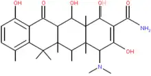 Les antibiotiques de la famille des cyclines sont des inhibiteurs de la traduction des protéines. Ils se lient de manière réversible à la sous-unité 30S du ribosome de la bactérie où se situe le centre de décodage de l'ARN messager[3] Cette liaison empêche la fixation de l'aminoacyl-ARNt sur le site A du ribosome ce qui conduit à un arrêt de l'élongation de la chaîne peptidique. Dans une moindre mesure, ils peuvent également se lier à la sous-unité 50S du ribosome bactérien pouvant altérer la membrane cytoplasmique et ainsi entraîner la perte de composants cellulaires vers l'extérieur de la bactérie[4].
