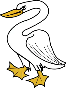 De gueules à un cygne d'argent becqué et lampassé d'or nageant sur une onde d'azur dans laquelle nage sous lui un poisson aussi d'argent loré d'or.