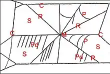 La toile des Cyrtarachne exotiques se compose d’une charpente de forme variable, en triangle ou en polygone plus complexe, de radii divergeant à partir d’un moyeu subcentral et de fils en pont pouvant former des cercles complets au travers des secteurs (Fig.6).