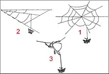 Selon une première hypothèse (Robinson & Robinson, 1975[4]; Eberhard1980[5]), les toiles auraient évolué par réduction progressive en trois étapes qui se sont succédé au fil du temps : le type à fils en pont (« spanning-thread webs » des anglo-saxons), le type en triangle, le type à bolas et, en fin de compte, la disparition pure et simple de tout édifice soyeux (Scharff & Coddington, 1997)[6].