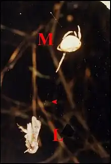 Les “Bolas spiders” ont un autre caractère unique dans le fait que leurs femelles adultes attirent exclusivement des Lépidoptères nocturnes, tous mâles, en émettant une substance chimique volatile véhiculée par l’air (Stowe et al., 1987 ; Yeargan, 1994)[17],[18] selon un mécanisme connu comme mimétisme sexuel phéromonal. En revanche, les mâles et les juvéniles n’attirent pas des Lépidoptères mais des Diptères Psychodidae, également mâles (Yeargan and Quate,1996,1997)[19],[20].