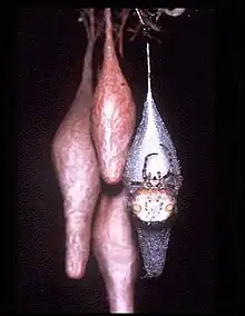 Les araignées de la sous-famille des Cyrtarachninae construisent des toiles d’une extraordinaire diversité structurale (Stowe,1986)[3] opposant les deux tribus constitutives de la sous-famille. Dans le cadre de cette industrie séricigène entre le tissage de cocons ovigères globuleux (Mastophora, Celaenia) (Fig.4) ou fusiformes (Cyrtarachne ixoides, Dicrostichus magnificus) (Fig.5).