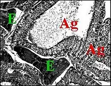 La structure ou, à l'inverse, l'absence de piège, et l'attraction des proies trouvent une explication logique révélée par la seule histologie de l'opisthosoma, débité en coupes sériées (C.H) respectivement dans les glandes séricigènes et dans l'existence d'un organe particulier remarquable, le tissu folliculaire endocrinoïde abdominal (Fig.12, 13), tel que Lopez l'a décrit pour la première fois chez les Mastophora[21].