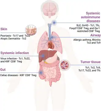 Un sous-ensemble de lymphocytes T CD8 produisant des cytokines Th2, appelés cellules Tc2, a été découvert dans les voies respiratoires et les tissus intraépithéliaux[55],[56]. La stimulation in vitro de lymphocytes T CD8 naïfs avec de l'interleukine 4 produit des lymphocytes T CD8 producteurs d'interleukine 4 et d'interleukine 5 [57],[58]. La production de cytokines des cellules Th2 par les cellules Tc2 a été favorisée par les facteurs de transcription STAT6 et GATA3, de manière similaire à l'effet de ces facteurs de transcription dans les cellules Th2 . Semblables aux cellules Th2, les cellules Tc2 stimulent la production d’immunoglobuline E par les cellules B, recrutent des éosinophiles et contribuent aux réponses allergiques[59],[60].