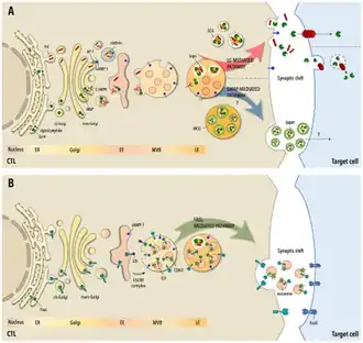 L'engagement du récepteur des lymphocytes T sur la cellule cible et son apposition étroite à la membrane synaptique dans un processus étroitement régulé par les cytosquelettes d'actine et de tubuline, qui prépare le terrain pour le transport de la granule au centre de la synapse immunologique[32],[33].Les granules lytiques enrichies en granzymes et et perforine acquièrent la capacité de s'ancrer à la membrane plasmique et de délivrer leur cargaison cytotoxique dans la fente synaptique à travers deux étapes de maturation séquentielles qui ont été largement caractérisées suite à l'identification de mutations génétiques responsables de troubles d'immunodéficience primaire associés à des lymphocyte T CD8+ défectueux[34]. L'amarrage de la granule à la membrane synaptique nécessite l'acquisition de deux régulateurs de trafic clés : la Rab GTPase Rab27 et ses effecteurs, les protéines secretory leukocyte protease inhibitor SLP1/2, et l'adaptateur Munc13-4 [35].