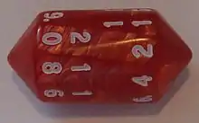 Utilisé couramment dans les jeux de rôle sur table pour obtenir des statistiques différentes de celles du dé à six faces classique, il se trouve généralement sous forme d'icosaèdre mais existe sous forme d'antiprisme. Il existait déjà au temps des Pharaons.