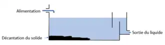 - Un décanteur - épaississeur a une forme cylindro-conique. Il est alimenté en son centre. Le liquide clarifié est récupéré par débordement dans une goulotte périphérique. Les particules décantées sont évacuées par le fond. Un système d'agitation permet de transférer les sédiments vers le fond et contribue à augmenter leur concentration[1]