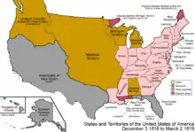 - 3 décembre : la partie sud du Territoire de l'Illinois devient le 21e État, l'Illinois, ce qui donne la majorité aux États antiesclavagistes. La partie nord est réassigné au Territoire du Michigan[1]
