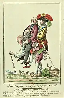 Allusion aux impôts dont le poids retombait en entier sur le peuple : M.M. les Eclésiastiques et les Nobles non seulement ne payoient rien, mais encore obtenoient des graces, des pensions qui épuisoient l'Etat et le Malheureux cultivateur pouvoit a peine fournir à sa subsistance.