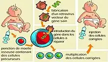 - l’introduction dans des cellules souches du patient de ce gène ex vivo ;