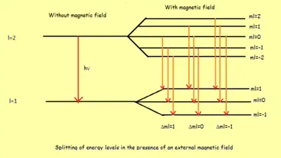 est dit le magnéton de Bohr. Selon la valeur de , chaque niveau dégénéré d'énergie se divise en plusieurs niveaux.