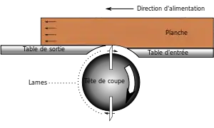 - d'un arbre porte fer, situé entre les deux tables, sur lequel sont fixés deux, trois ou quatre fers (les lames retirant le bois lors de la passe).