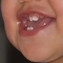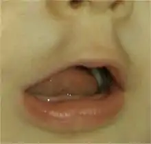 - La déglutition salivaire, infantile (enfant) et atypique (adolescent, adulte), se caractérise par 1500 à 2000 interpositions linguales entre les arcades dentaires. De plus, cet épanchement horizontal de la langue favorise des pressions verticales sur les faces triturantes (occlusales) des dents permanentes en éruption (permutations dentaires de 6 à 14 ans) : ces pressions axiales freinent et arrêtent prématurément l'éruption des dents[29],[30],[31] et c'est une des causes de l'infraclusion organique[6] : les dents permanentes restent enfouies dans la gencive. Cliniquement, elles apparaissent « trop petites » .
