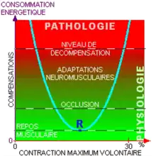 - Système d'action et boucle de prévision. Le mouvement postural[24] en RMDA[11], ou postures dynamiques réflexes, est influencé / régulé par la proprioception et, notamment, les mécanorécepteurs dentaires (« sensibilité tactile fine »[16],[17]), les fuseaux neuromusculaires et les récepteurs articulaires. Le principal but de ce jeu réflexe est de consommer le moins d'énergie possible pour réaliser le même travail : économiser l'énergie biologique (adénosine triphosphate, ATP).