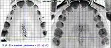 - L'analyse vidéographique numérique (voir « 6.2 Analyse fonctionnelle des signes » ci-avant) permet d'évaluer ces références physiologiques. Dans la déglutition atypique, l'espace libre est dysfonctionnel (trop grand). Corollairement, on estime la hauteur à ajouter aux dents naturelles pour obtenir un espace libre physiologique de 1,6 millimètre[6],[57],[58].