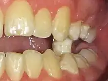 - Le traitement par PMRI-PO en résine est provisoire[60] et, au plus tôt, il servira de « patron », comme en couture, pour réaliser la prise d'articulé fine[61] de l'armature métallique des couronnes et bridges en porcelaine (restauration permanente).