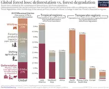 Depuis 1990, on estime qu'environ 420 millions d'hectares de forêts ont été perdus à cause du changement d'affectation des sols pour d'autres usages (agriculture, urbanisation...), bien que le taux de déforestation ait diminué au cours des trois dernières décennies. Entre 2015 et 2020, le taux de déforestation a été estimé à 10 millions d'hectares par an, contre 16 millions d'hectares par an dans les années 1990. La superficie de forêt primaire dans le monde a diminué de plus de 80 millions d'hectares depuis 1990. Plus de 100 millions d'hectares de forêts sont affectés par les incendies de forêt, les ravageurs, les maladies, les espèces envahissantes, la sécheresse et les phénomènes météorologiques extrêmes[1]