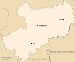 Dans sa configuration définitive, elle confinait au nord avec les délégations de Pérouse et Camerino, à l’est avec la délégation d'Ascoli, au sud ave la délégation de Rieti et le Royaume des Deux-Siciles et à l’ouest avec la délégation de Viterbe.