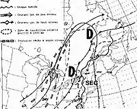 Le front, que l'on voit sur la carte d'analyse de 1200 TU le 14 juillet, 8h locale, était supporté en altitude par un creux barométrique à 500 hPa d'intensité moyenne. La carte montre également la formation d'une dépression en surface, juste au sud-ouest d'Ottawa (Ontario). Cette cyclogénèse semble directement liée à l'amplification du creux d'altitude. La formation de cumulonimbus de forte extension verticale était favorisée en cette matinée par de l'air très chaud et très humide en surface, une intrusion d'air plus sec dans les niveaux moyens, une divergence des vents en altitude et d'une convergence accrue en surface à cause de la dépression[3].