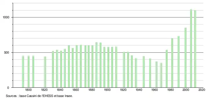 L'évolution du nombre d'habitants est connue à travers les recensements de la population effectués périodiquement dans la commune depuis 1793. Après une phase de relative stabilité au XIXe siècle et au début du XXe siècle, la population de la commune a décru pour atteindre un minimum en 1968 avec 348 habitants pour ensuite croître selon un rythme similaire à celui de la région.
