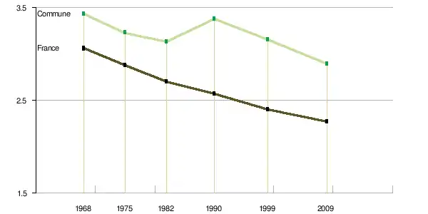 Le nombre de ménages[Note 3] tend à croître plus vite que la population : + 1,72 % par an en moyenne en France métropolitaine pour le nombre de ménages entre 1968 et 2009, + 0,74 % pour la population (tableau ci-après). Le nombre moyen de personnes par ménage tend en effet à baisser : égal à 3,06 en 1968, il n’est plus que de 2,4 en 1999 et de 2,27 en 2009[16]. La tendance est similaire pour la commune. Le nombre moyen de personnes par ménage tend également à baisser : égal à 3,43 en 1968, il n’est plus que de 3,15 en 1999 et de 2,89 en 2009[13].