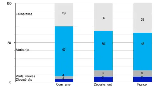 L'état matrimonial légal désigne, selon l'Insee, la situation conjugale d'une personne au regard de la loi : célibataire, mariée, veuve, divorcée[Note 2].En 2009, la commune comptait 28,9 % de célibataires, 62,6 % de personnes mariées, 4,3 % de veufs ou veuves et 4,2 % de divorcé(e)s[13]. Le taux de personnes mariées apparaît ainsi très supérieur à celui du département (49,8 %)[14] mais aussi de la France (47,5 %)[15].