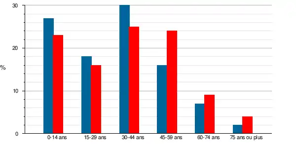 La population a vieilli entre 1999 et 2009, le taux des personnes de 60 ans et plus passant de 9 % à 13 %, à l'instar des populations du département et de la France qui sont aussi passées respectivement de 20 à 23 % pour le Département et de 20 à 23 % pour la France métropolitaine.