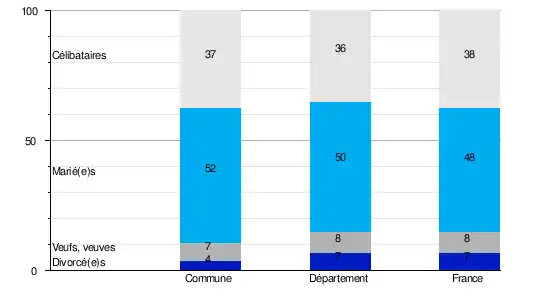 L'état matrimonial légal désigne, selon l'Insee, la situation conjugale d'une personne au regard de la loi : célibataire, mariée, veuve, divorcée[Note 2].En 2009, la commune comptait 37,3 % de célibataires, 51,7 % de personnes mariées, 6,8 % de veufs ou veuves et 4,2 % de divorcé(e)s[13]. Le taux de personnes mariées apparaît ainsi supérieur à celui du département (49,8 %)[14] mais aussi de la France (47,5 %)[15].
