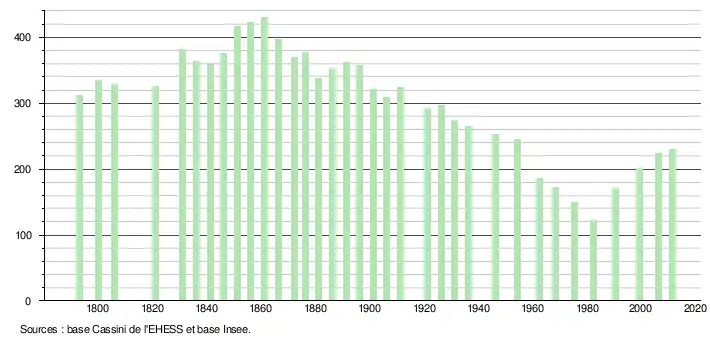 Le taux de mortalité est quant à lui passé de 14,2 ‰ sur la période 1968-1975 à 5,6 ‰ sur la période 1999-2009[5]. Celui du département était sur cette dernière période de 8,5 ‰ et celui de la France de 8,8 ‰[8].