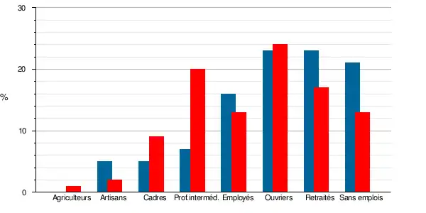 | Ouvriers | 78 | 24,4 | 52 | 22,8 | 16,8 | 18,6 | 13,5 | 14,9 |