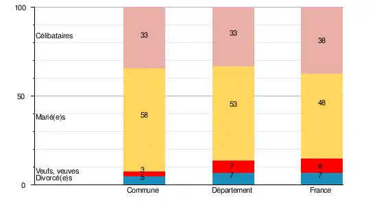 En 2009, la commune comptait 33,1 % de célibataires, 58,4 % de personnes mariées, 3,3 % de veufs ou veuves et 5,2 % de divorcé(e)s[11]. Le taux de personnes mariées apparaît ainsi très supérieur à celui du département (52,5 %)[12] mais aussi de la France (47,5 %)[13].