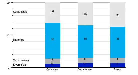 L'état matrimonial légal désigne, selon l'Insee, la situation conjugale d'une personne au regard de la loi : célibataire, mariée, veuve, divorcée[Note 2].En 2009, la commune comptait 30,8 % de célibataires, 55,3 % de personnes mariées, 8,4 % de veufs ou veuves et 5,5 % de divorcé(e)s[13]. Le taux de personnes mariées apparaît ainsi très supérieur à celui du département (49,8 %)[14] mais aussi de la France (47,5 %)[15].