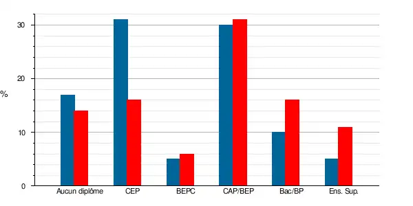 | Titulaires du certificat d'études primaires | 107 | 15,6 % | 188 | 30,5 % | 12,4 | 19 | 11,1 | 17,6 |