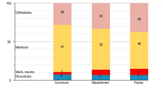 En 2009, la commune comptait 28,7 % de célibataires, 60,8 % de personnes mariées, 3 % de veufs ou veuves et 7,5 % de divorcé(e)s[11]. Le taux de personnes mariées apparaît ainsi très supérieur à celui du département (52,5 %)[12] mais aussi de la France (47,5 %)[13].