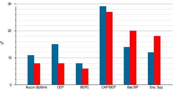 | Titulaires du certificat d'études primaires | 53 | 7,9 % | 69 | 15,3 % | 11,2 | 18,4 | 11,1 | 17,6 |