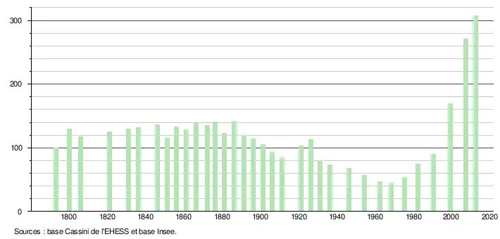 L'évolution du nombre d'habitants est connue à travers les recensements de la population effectués périodiquement dans la commune depuis 1793. Après une phase de relative stabilité au XIXe siècle, la population de la commune a décru pour atteindre un minimum en 1962 avec 47 habitants. Elle croît ensuite de manière très forte.
