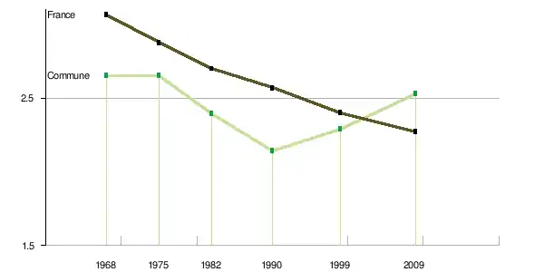 Le nombre de ménages[Note 3] tend à croître plus vite que la population : + 1,72 % par an en moyenne en France métropolitaine pour le nombre de ménages entre 1968 et 2009, + 0,74 % pour la population (tableau ci-après). Le nombre moyen de personnes par ménage tend en effet à baisser : égal à 3,06 en 1968, il n’est plus que de 2,4 en 1999, mais remonte à 2,27 en 2009[16]. La tendance est similaire pour la commune. Le nombre moyen de personnes par ménage tend également à baisser : égal à 2,65 en 1968, il n’est plus que de 2,29 en 1999 et de 2,53 en 2009[13].