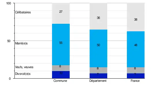 L'état matrimonial légal désigne, selon l'Insee, la situation conjugale d'une personne au regard de la loi : célibataire, mariée, veuve, divorcée[Note 2].En 2009, la commune comptait 26,9 % de célibataires, 55,2 % de personnes mariées, 7,5 % de veufs ou veuves et 10,4 % de divorcé(e)s[13]. Le taux de personnes mariées apparaît ainsi très supérieur à celui du département (49,8 %)[14] mais aussi de la France (47,5 %)[15].