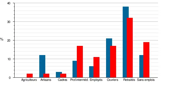 | Ouvriers | 39 | 16,7 | 28 | 20,6 | 15,7 | 17,3 | 13,5 | 14,9 |