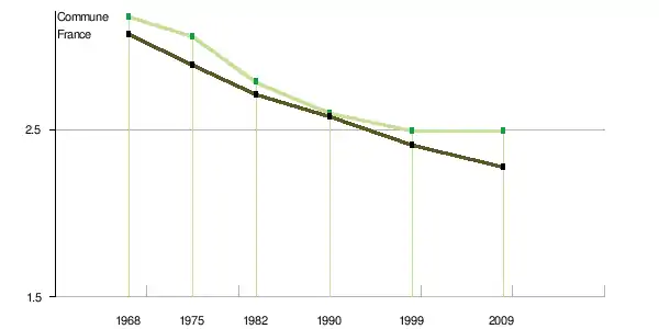 Le nombre de ménages[Note 3] tend à croître plus vite que la population : + 1,72 % par an en moyenne en France métropolitaine pour le nombre de ménages entre 1968 et 2009, + 0,74 % pour la population (tableau ci-après). Le nombre moyen de personnes par ménage tend en effet à baisser : égal à 3,06 en 1968, il n’est plus que de 2,4 en 1999 et de 2,27 en 2009[16]. La tendance est similaire pour la commune. Le nombre moyen de personnes par ménage tend également à baisser : égal à 3,17 en 1968, il n’est plus que de 2,49 en 1999 et de 2,49 en 2009[13].