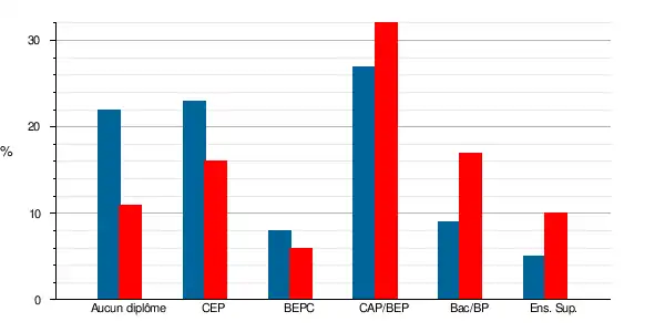 | Titulaires du BEPC, brevet des collèges | 30 | 6,4 % | 33 | 8,1 % | 6,1 | 7,7 | 6,3 | 8,1 |