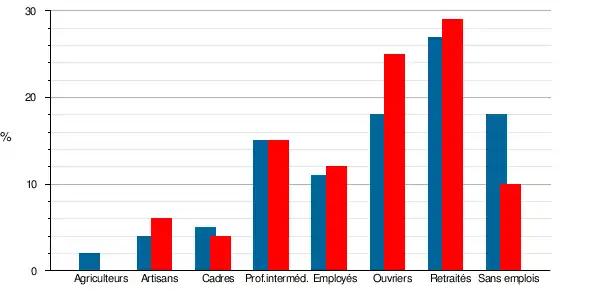| Artisans, commerçants, chefs d'entreprise | 28 | 5,7 | 16 | 3,8 | 2,8 | 3 | 3,3 | 3,5 |