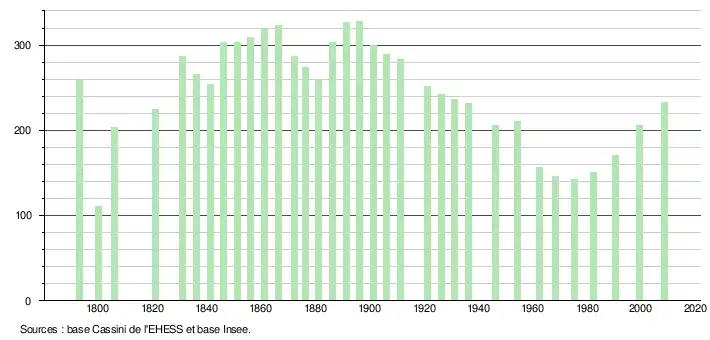 L'évolution du nombre d'habitants est connue à travers les recensements de la population effectués périodiquement dans la commune depuis 1793. Une réforme du mode de recensement permet à l'Insee de publier les populations légales des communes annuellement à partir de 2006. Pour les communes de moins de 10 000 habitants, les recensements ont lieu tous les cinq ans, les populations légales intermédiaires sont quant à elles estimées par calcul[1]. Le premier recensement exhaustif de la commune entrant dans le cadre de ce nouveau dispositif a eu lieu en 2008[2].