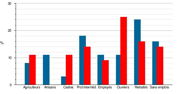 | Artisans, commerçants, chefs d'entreprise | 0 | 0 | 16 | 10,5 | 3,7 | 4,2 | 3,3 | 3,5 |