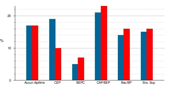 Le taux de personnes non scolarisées sans diplôme a augmenté entre 1999 (16,8 %) et 2009 (16,8 %)[14]. Il est inférieur à celui de l'Ain (17,1 %) et à celui de la France métropolitaine (18,3 %)[15]. Parallèlement le taux de personnes titulaires d'un diplôme de l'enseignement supérieur long est passé de 9,7 % en 1999 à 12 % en 2009, un taux supérieur à celui de l'Ain (10,6 %)[16] et au taux national relatif à la France métropolitaine (12,7 %)[15].