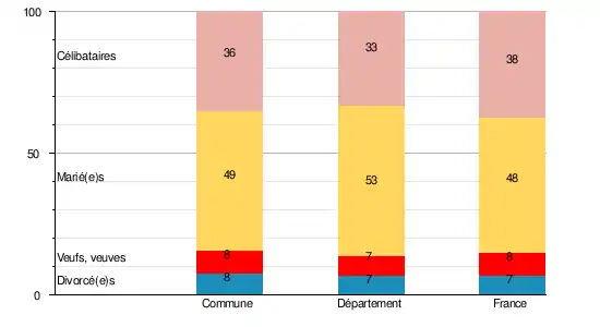 En 2009, la commune comptait 35,5 % de célibataires, 48,5 % de personnes mariées, 8,1 % de veufs ou veuves et 8 % de divorcé(e)s[11]. Le taux de personnes mariées apparaît ainsi inférieur à celui du département (52,5 %)[12] et supérieur à celui de la France (47,5 %)[13].