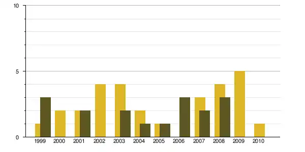 | 1968 à 1975 | 1975 à 1982 | 1982 à 1990 | 1990 à 1999 | 1999 à 2009 | ||