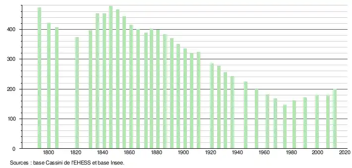 Le taux de mortalité est quant à lui passé de 15,4 ‰ sur la période 1968-1975 à 9,4 ‰ sur la période 1999-2009[5]. Celui du département était sur cette dernière période de 8,5 ‰ et celui de la France de 8,8 ‰[8].