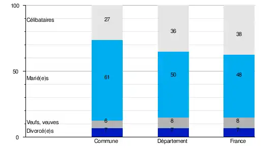 L'état matrimonial légal désigne, selon l'Insee, la situation conjugale d'une personne au regard de la loi : célibataire, mariée, veuve, divorcée[Note 2].En 2009, la commune comptait 26,9 % de célibataires, 60,5 % de personnes mariées, 5,8 % de veufs ou veuves et 6,8 % de divorcé(e)s[13]. Le taux de personnes mariées apparaît ainsi très supérieur à celui du département (49,8 %)[14] mais aussi de la France (47,5 %)[15].